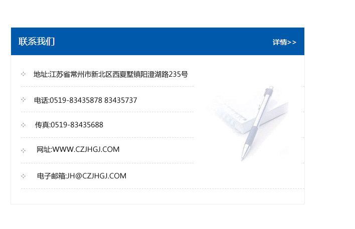 地址:常州市新北區友邦商務大廈1幢16、17層  電話:0519-85101652  傳真:0519-85112595  郵編:213022  網址:www_cz-jiayue_cn.jmsjdgs.com  郵箱:xiajifengaa@163.com